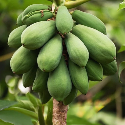 Voici un beau papayer au fruit comestible, il pousse en donnant un beau tronc et des feuilles très dĂ©coupĂ©es Ă l’allure tropicale et se cultive facilement . Il fleurit en donnant une belle fleur jaune qui donnera chaque annĂ©e plusieurs dĂ©licieux fruits de papaye de 25/30cm de long, jaune vif. Sa douce chair jaune est un savant mĂ©lange de saveur de papaye et d’ananas avec quelques pointes de kiwi et de fraise. il peut ĂŞtre dĂ©gustĂ© cru et bien sur en plat cuisinĂ©. Il est autofertile.